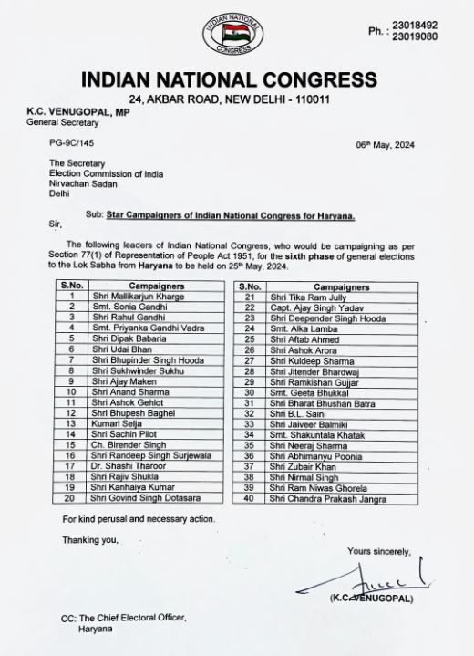 वहीं कांग्रेस की स्टार प्रचारकों की लिस्ट में सबसे पहले कांग्रेस कमेटी के राष्ट्रीय अध्यक्ष मल्लिकार्जुन खरगे, सोनिया गांधी, राहुल गांधी, प्रियंका गांधी, केसी वेणुगोपाल, हिमाचल कांग्रेस प्रभारी राजीव शुक्ला, मुकुल वासनिक, मुख्यमंत्री सुखविंदर सिंह सुक्खू, हिमाचल कांग्रेस अध्यक्ष प्रतिभा सिंह, पूर्व केंद्रीय मंत्री आनंद शर्मा, हरियाणा के पूर्व मुख्यमंत्री भूपेंद्र सिंह हुड्डा, रणदीप सिंह सुरजेवाला, कुमारी शैलजा और छत्तीसगढ़ के पूर्व मुख्यमंत्री भूपेश बघेल समेत 40 लोगों के नाम शामिल हैं।