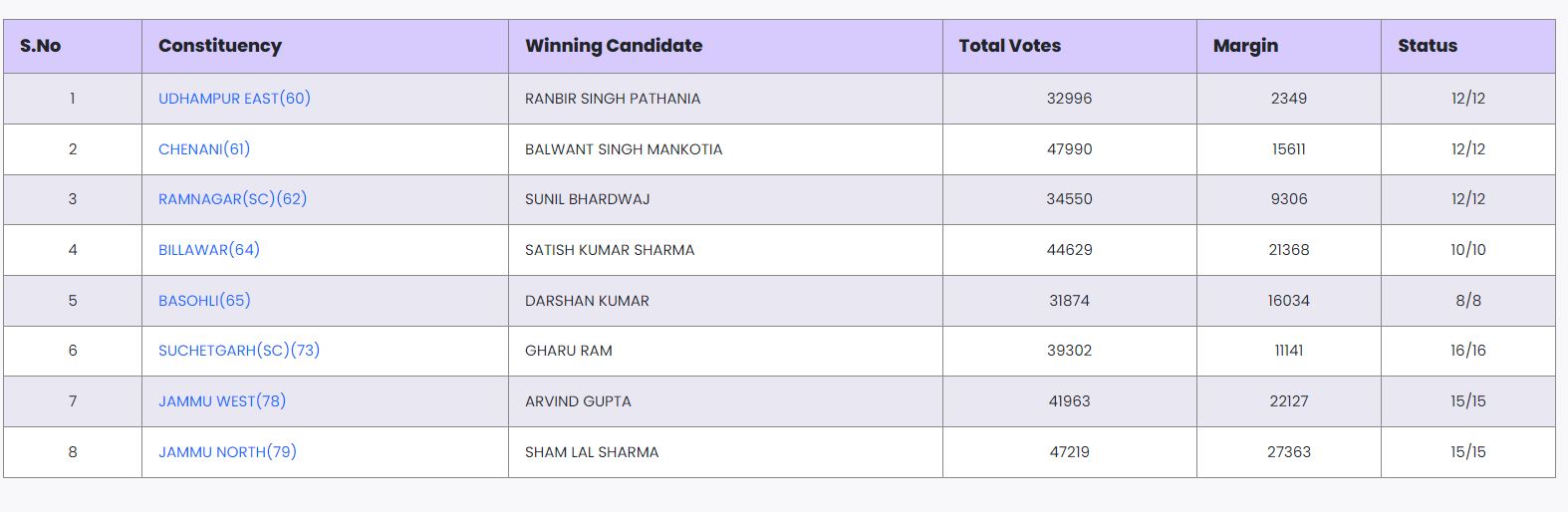 - चुनाव आयोग के आंकड़ों के अनुसार, BJP के दर्शन कुमार ने बसोहली विधानसभा सीट जीत ली है, उन्होंने कांग्रेस के लाल सिंह को 16,034 मतों के अंतर से हराया है।