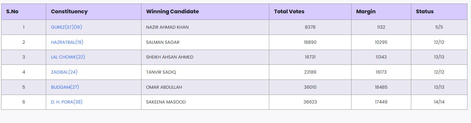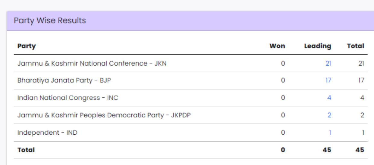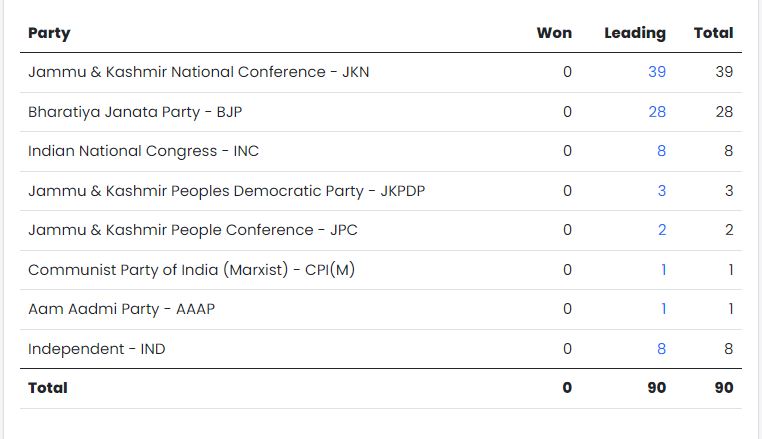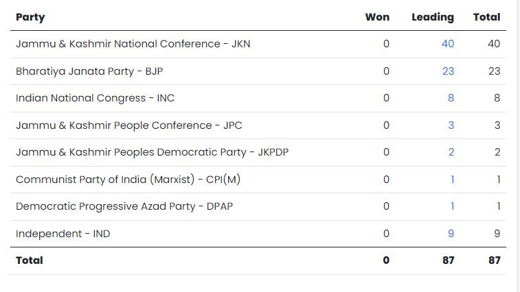 - 90 में से 87 सीटों के लिए चुनाव आयोग के आधिकारिक रुझान- जेकेएनसी 40 पर, भाजपा 23 पर, कांग्रेस 8 पर, जेपीसी 3 , पीडीपी 2 सीपीआई(एम) और डीपीएपी 1-1 सीट पर आगे हैं।