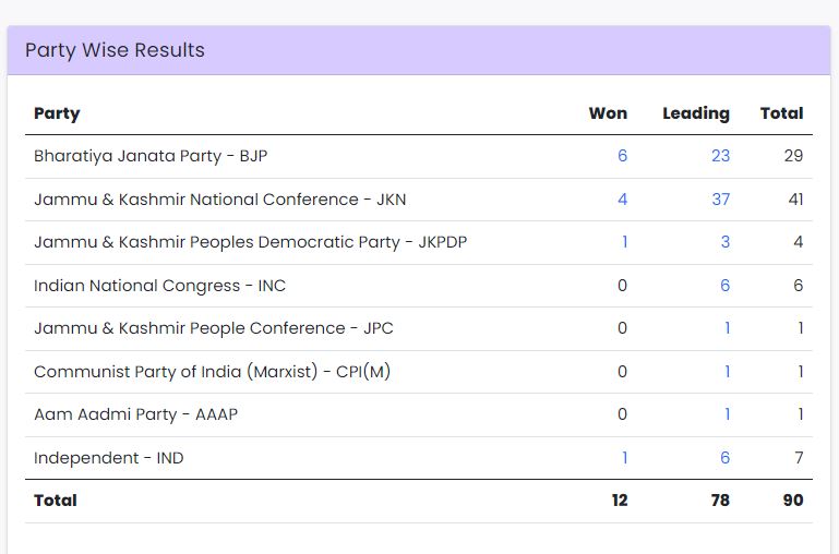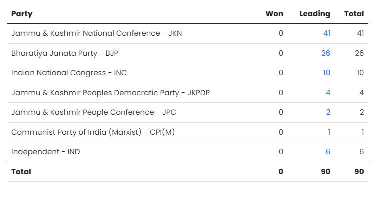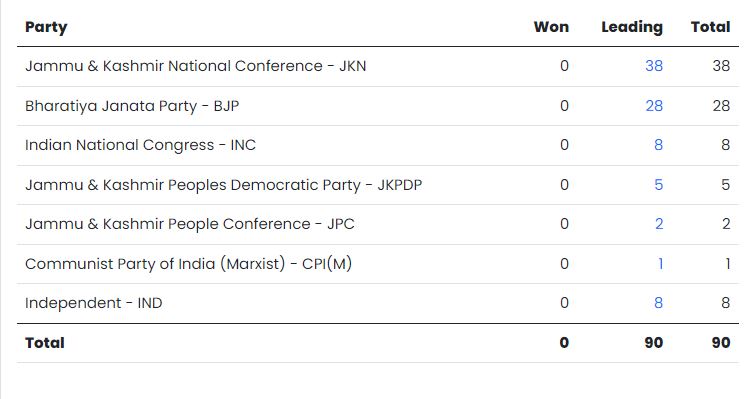 - चुनाव आयोग के आंकड़ों के अनुसार, जेकेएनसी 38 पर, भाजपा 28 पर, कांग्रेस 8 पर, पीडीपी 5, जेपीसी 2 और सीपीआई(एम) 1 सीट पर आगे हैं।