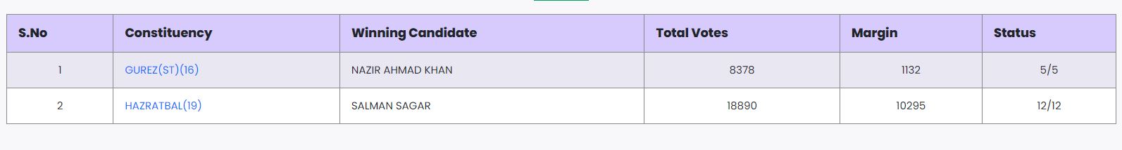 - नेशनल कॉन्फ्रेंस के 2 उम्मीदवारों ने जीत दर्ज कर ली है। इनमें गुरेज विधानसभा क्षेत्र से नेशनल कॉन्फ्रेंस के उम्मीदवार नजीर अहमद खान विजयी हुए हैं। उन्होंने इस सीट पर कुल 8,378 वोट हासिल किए और अपने निकटतम प्रतिद्वंद्वी को 1,132 मतों के अंतर से हराया है। वहीं, हजरतबल विधानसभा क्षेत्र से नेशनल कॉन्फ्रेंस (NC) के सलमान सागर ने जीत हासिल की है।