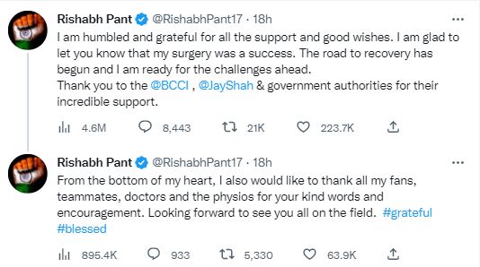 वहीं, ऋषभ पंत ने आगे एक इंस्टाग्राम पोस्ट में लिखा, "मैं सभी समर्थन और शुभकामनाओं के लिए आभारी हूं। बस सभी को बताना चाहता हूं कि मेरी सर्जरी सफल रही, और मैं आभारी हूं कि मैं ठीक होने के रास्ते पर हूं। मैं हर दिन बेहतर महसूस कर रहा हूं। मैं इस कठिन समय के दौरान आपके समर्थन और सकारात्मक ऊर्जा के लिए आप सभी का आभार व्यक्त करना चाहता हूं।"