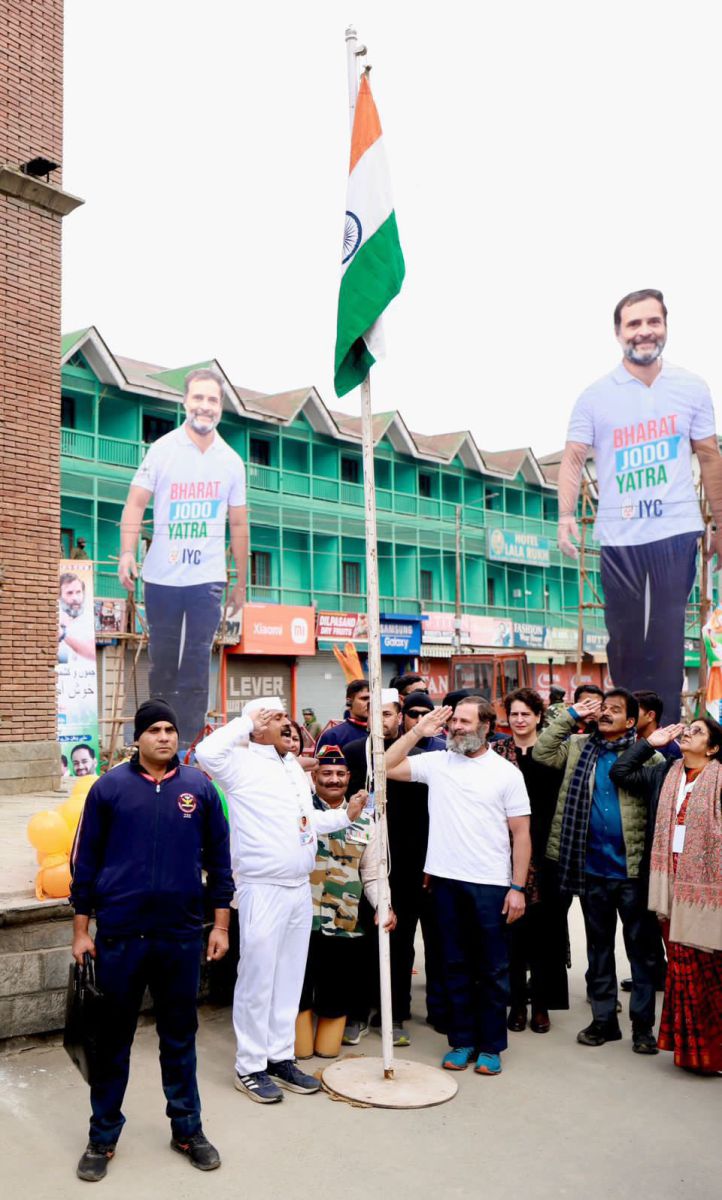कांग्रेस नेता राहुल गांधी ने ‘भारत जोड़ो यात्रा’ के तहत रविवार को श्रीनगर में लाल चौक के ऐतिहासिक घंटाघर पर कड़ी सुरक्षा के बीच तिरंगा फहराया। तिरंगा फहराने के लिए घंटाघर की ओर रवाना होने से पहले राहुल ने सोनावर में यात्रा से 30 मिनट का विश्राम लिया और प्रदेश कांग्रेस कमेटी के मौलाना आज़ाद रोड स्थित मुख्यालय पहुंचे।