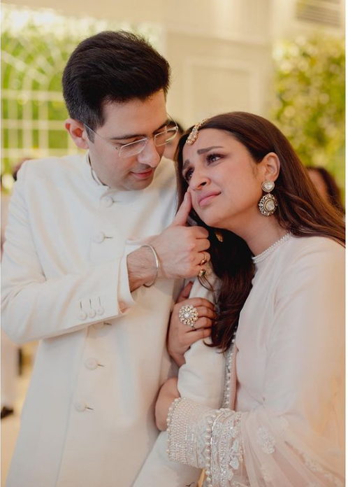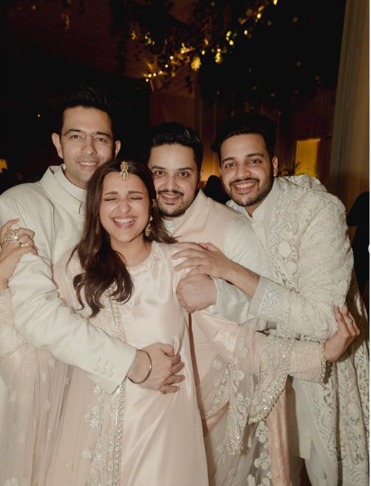 - पहली तस्वीर में राघव परिणीति को बड़े ही प्यार से थामे हुए नजर आ रहे हैं, तो वहीं दूसरी तस्वीर में एक्ट्रेस अपने दोनों भाई शिवांग और सहज के साथ-साथ मंगेतर राघव चड्ढा के साथ दिल खोलकर हंसती हुई नजर आ रही हैं।