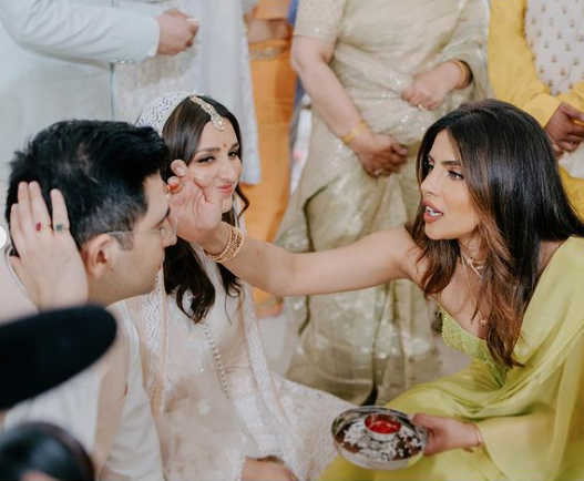 - वहीं, एक फोटो में प्रियंका चोपड़ा अपने बहनोई राघव चड्ढा का तिलक करती हुई दिखाई दीं।