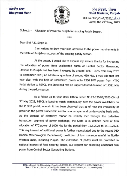 पंजाब के मुख्यमंत्री भगवंत मान ने केंद्र सरकार को पत्र लिखा है। इसमें उन्होंने केंद्र से आगामी धान के मौसम के लिए अतिरिक्त 1,000 मेगावॉट (एमडब्ल्यू) बिजली की मांग की है।
