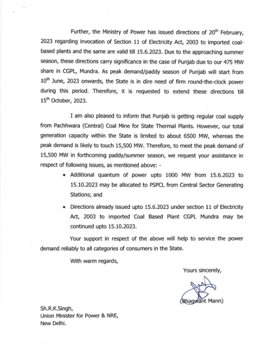 केंद्रीय बिजली मंत्री आर.के. सिंह को लिखे पत्र में सीएम मान ने कहा कि राज्य की बिजली उत्पादन क्षमता 6,500 मेगावॉट है, जबकि गर्मी के मौसम में उच्चतम मांग 15,500 मेगावॉट तक पहुंचने की संभावना है।