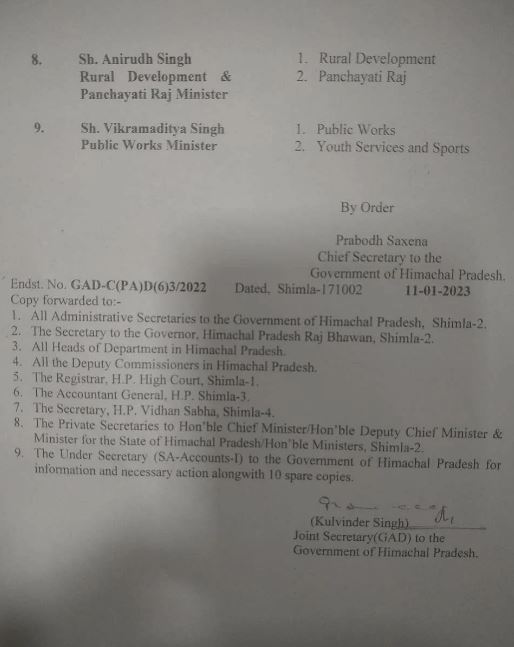 विक्रमादित्य सिंह- लोक निर्माण विभाग और युवा सेवा एंव खेल मंत्री की जिम्मेदारी सौंपी गई है। ये पूर्व मुख्यमंत्री वीरभद्र सिंह के बेटे है।