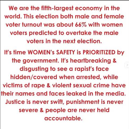 प्रीति जिंटा ने भावुक होकर लिखा हैं, हम इस दुनिया की 5वीं सबसे बड़ी इकोनॉमी हैं। चुनाव में महिलाओं और पुरुष को मिलाकर 66 प्रतिशत लोगों ने वोट दिया, जिस पर अनुमान लगाया जा रहा है कि अगले साल महिला वोटर्स पुरुषों से ज्यादा होंगी। अब वक्त आ चुका है कि महिलाओं की सुरक्षा सरकार के लिए पहली प्राथमिकता होनी चाहिए। ये देखना बेहद हार्टब्रेकिंग और दर्दनाक है कि रेप करने वाले आरोपी का चेहरा गिरफ्तारी के समय ढका रहता है, जबकि पीड़ित का चेहरा और नाम मीडिया में हर तरफ लीक किया जाता है। न्याय की रफ्तार कभी तेज नहीं होती, सजा कभी नहीं दी जाती, लोगों को कभी जवाबदेह नहीं ठहराया जाता।.JPG)