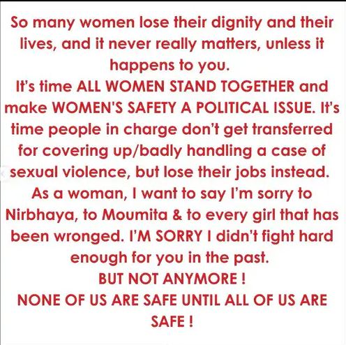 इसके आगे प्रीटि जिंटा ने लिखा है, कई महिलाएं अपनी गरिमा और जिंदगी खो देती हैं, लोगों को इससे तब तक फर्क नहीं पड़ेगा, जब तक ये आपके साथ न हो। ये वक्त है कि सभी महिलाएं एक साथ खड़ी हों और महिला सुरक्षा को एक पॉलिटिकल इशू बनाएं। इस समय सेक्शुअल वायलेंस के केस को बुरी तरह हैंडल करने वाले इंचार्ज का ट्रांसफर न हो, बल्कि उनकी नौकरियां छीनी जाएं। एक महिला के रूप में मैं निर्भया और मौमिता और हर उस लड़की से माफी मांगना चाहती हूं, जिनके साथ गलत हुआ। मैं माफी चाहती हूं कि पास्ट में मैं आपके लिए पूरी ताकत से नहीं लड़ सकी। लेकिन अब बहुत हुआ। कोई भी सुरक्षित नहीं है, जब तक सबसुरक्षित नहीं हैं।