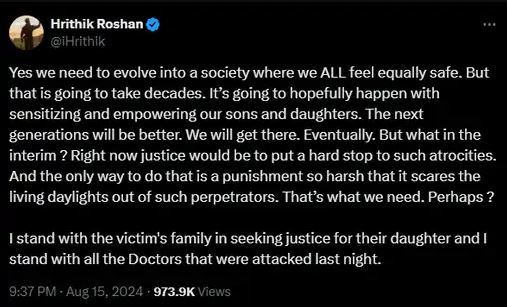 ऋतिक रोशन ने सोशल मीडिया प्लेटफॉर्म X पर लिखा है, हमें एक ऐसी सोसाइटी बनाने की जरुरत है, जहां हर कोई सुरक्षित महसूस करे। लेकिन इसमें दशक लगेंगे। उम्मीद है कि इससे हमारे बेटे और बेटियां संवेदनशील और सशक्त बनाने से होगा। अगली जनरेशन बेहतर होगी। हम वहां मिलेंगे। फिलहाल न्याय यही होगा कि ऐसे अत्याचारों पर सख्ती से रोक लगाई जाए। इसका इकलौता तरीका है आरोपियों को कड़ी सजा देना कि उस तरह के अपराधी डर जाएं। हमें यही चाहिए। मैं पीड़ित के परिवार के साथ खड़ा रहकर उनकी बेटी को न्याय दिलाने की मांग करता हूं और जिन डॉक्टर्स पर हमला हुआ उनके साथ भी खड़ा हूं।