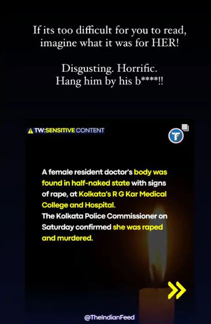 कोलकाता के आरजी कर मेडिकल कॉलेज में ट्रेनी डॉक्टर संग हुई रेप और मर्डर की वीभत्स घटना से पूरा देश सहम गया है। इस घटना ने देश की जनता को हिलाकर रख दिया है। जूनियर डॉक्टर संग हुए इस अपराध ने साल 2012 में हुए निर्भया रेप और मर्डर केस की याद दिला है। ट्रेनी डॉक्टर को न्याय दिलाने के लिए अब जनता के साथ-साथ बॉलीवुड सितारे भी उतर रहे हैं। एक्ट्रेस करीना कपूर से लेकर मलाइका अरोड़ा और आलिया भट्ट समेत फिल्म इंडस्ट्री के दिग्गज सितारे ट्रेनी डॉक्टर के लिए न्याय की गुहार लगा रहे हैं। जहां कुछ सेलेब्स देश में महिलाओं की स्थिति पर चिंता जाहिर कर रहे हैं तो कुछ सितारों को 2012 में दिल्ली में हुए निर्भया रेप केस की याद आ गई है।