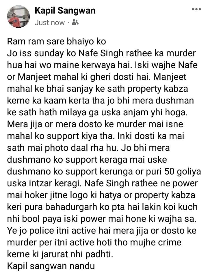 नंदू ने अपने इंस्टा पोस्ट में लिखा, "राम राम सारे भाइयों को। जो इस संडे को नफे सिंह राठी का मर्डर हुआ है, वो मैंने (नंदू) करवाया है। इस हत्या की वजह नफे सिंह और मंजीत माहल की गहरी दोस्ती है। मंजीत माहल भाई संजय के साथ प्रॉपटी पर कब्जा करने का काम करता था। जो भी मेरे दुश्मनों के साथ हाथ मिलाएगा उसका यही अंजाम होगा। मेरे जीजा और मेरे दोस्तों के मर्डर में भी राठी ने माहल को सपोर्ट किया था। जो भी मेरे दुश्मनों को सपोर्ट करेगा, 50 गोलियां उसका इंतजार करेंगी। नफे सिंह राठी पावर में होकर जितने लोगों की हत्या और प्रॉपटी पर कब्जा कर चुका है, इस बारे में पूरे बहादुरगढ़ को पता है, लेकिन कोई कुछ बोल ही नहीं पाया राठी की पावर की वजह से। ये जो पुलिस इतनी एक्टिव है, मेरे जीजा और दोस्तों के मर्डर पर इतना एक्टिव होती तो मुझे क्राइम करने की जरूरत नहीं पड़ती। कपिल सांगवान नंदू।"