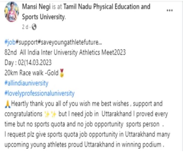 • गोल्डन गर्ल मानसी नेगी का छलका दर्द, फेसबुक पर लिखा- उत्तराखंड में कोई खेल कोटा नहीं है और ना...