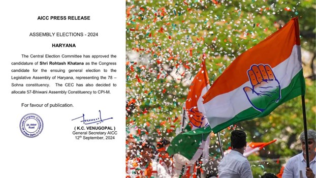 Haryana Election 2024: हरियाणा विधानसभा चुनाव के लिए कांग्रेस ने अपनी छठी और आखिरी सूची जारी कर दी है। इस लिस्ट में पार्टी ने CPI-M के साथ गठबंधन कर सोहना से रोहताश खटाना को उतारा है जबकि भिवानी से ओमप्रकश को टिकट दिया है।