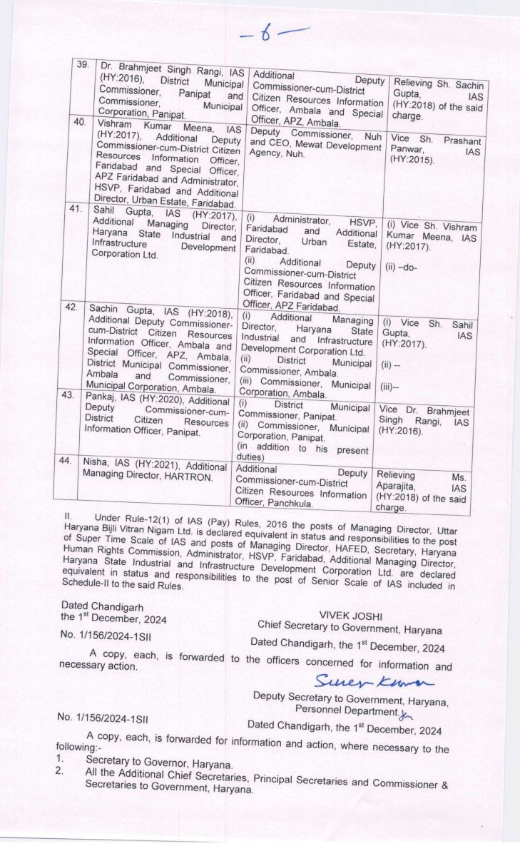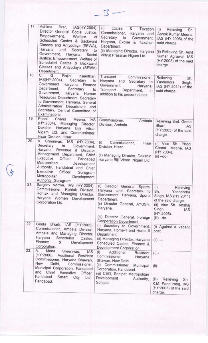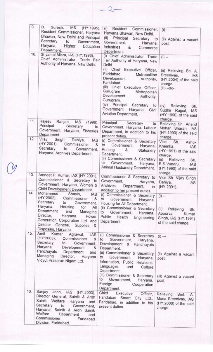 -एक श्रीनिवास को हिसार डिवीजन का आयुक्त और दक्षिण हरियाणा बिजली निगम का एमडी नियुक्त किया गया।