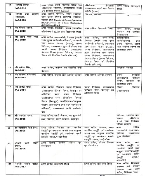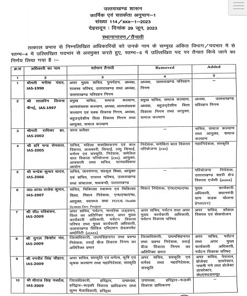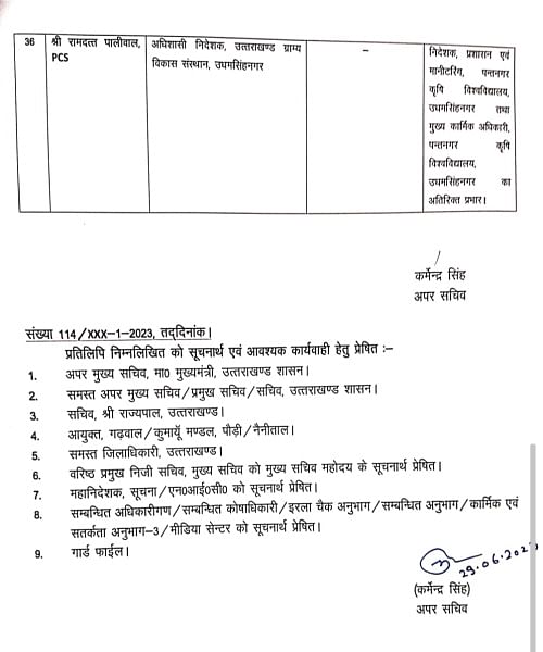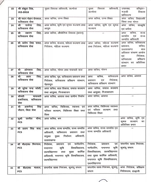उत्तराखंड में देर रात बड़ा प्रशासनिक फेरबदल देखने को मिला है। बड़ी संख्या में 22 IAS और 5 PCS समेत 36 अधिकारियों के ट्रांसफर किए गए हैं। देर रात जारी तबादला आदेश में उधमसिंह नगर जिले के वर्तमान जिलाधिकारी युगल किशोर पंत का स्थान ग्रहण करेंगे वहीं IAS अधिकारी उदय राज सिंह को उधमसिंहनगर के नए जिलाधिकारी की जिम्मेदारी दी गई है। युगल किशोर की शासन में अपर सचिव पद पर वापसी हो गई है। वहीं प्रतीक्षारत राधिका झा को सचिव एवं आयुक्त समाज कल्याण बनाया गया है। गुरुवार को देर रात अपर सचिव कर्मेन्द्र सिंह ने इसके आदेश जारी किए हैं।