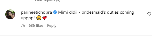 वहीं, इस पर रिएक्ट करते हुए, परिणीति ने जवाब दिया, "मिमी दीदी- ब्राइड्समेड की ड्यूटी आ रही है।" जानकारी के लिए आपको बता दें कि परिणीति प्यार से प्रियंका को 'मिमी दीदी' कहकर बुलाती है।