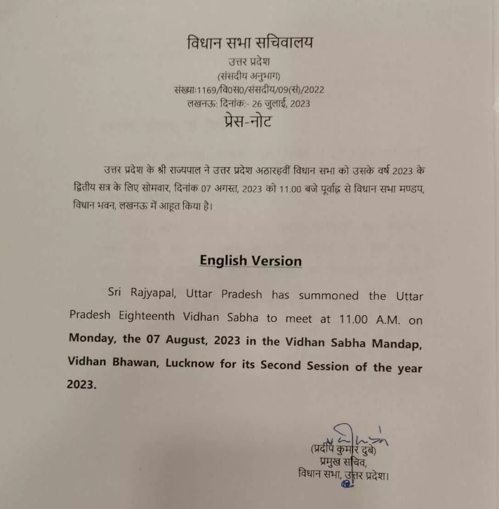 UP Assembly Monsoon Session: उत्तर प्रदेश में राज्य विधानसभा का मॉनसून सत्र 7 अगस्त से शुरू होगा। प्रदेश का यह इस साल का विधानमंडल का दूसरा सत्र होगा। इससे पहले फरवरी में बजट सत्र बुलाया गया था, जो 20 फरवरी से 3 मार्च तक चला था। फिलहाला राज्याल आनंदीबेन पटेल ने विधानमंडल का मॉनसून सत्र बुलाया है। इस सत्र में राज्य सरकार कई विधेयक पारित कर सकती है।