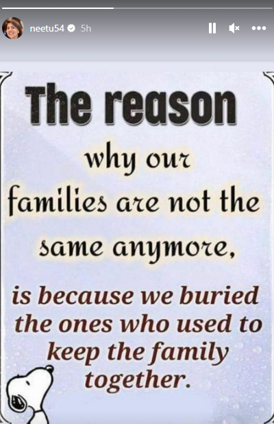 बता दें कि 19 जुलाई 2023 को नीतू कपूर ने अपनी इंस्टाग्राम स्टोरी पर एक सीक्रेट नोट साझा किया, जिससे उनके फैंस हैरान हो गए। उनके सोशल मीडिया पोस्ट में परिवारों के अब पहले जैसे नहीं रहने के बारे में एक पिक्चर नोट दिखाया गया है।
