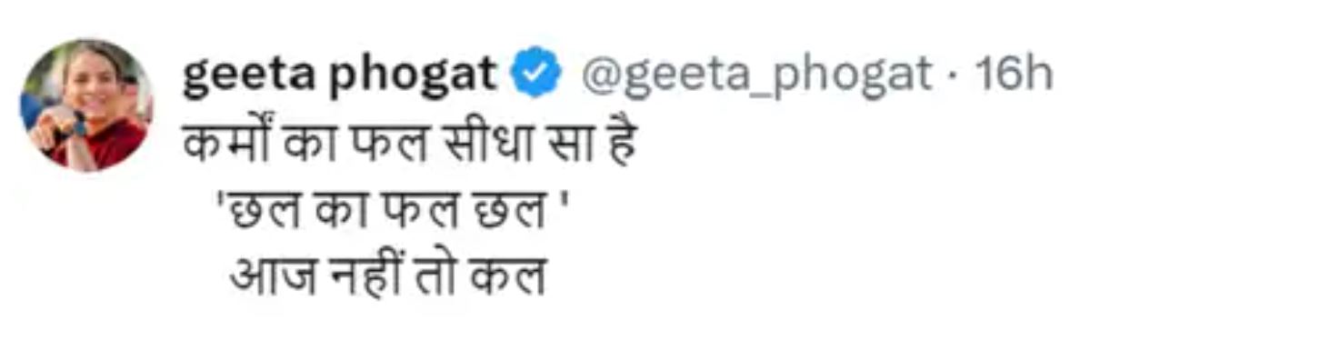वहीं गीता फोगाट ने बिना किसी का नाम लिखे सोशल मीडिया पर लिखा, 'कर्मों का फल सीधा सा है, छल का फल छल, आज नहीं तो कल।'