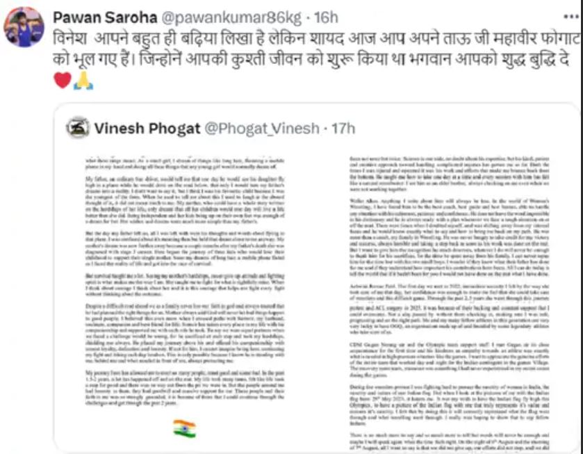 लेटर शेयर करने के बाद विनेश के चचेरी बहन गीता फोगाट के पति पवन सरोहा ने सोशल मीडिया (X) पर लिखा, 'विनेश आपने बहुत बढ़िया लिखा है लेकिन आपने अपने ताऊ जी को भूल गई। जिन्होंने ने आपकी कुश्ती जीवन को शुरु किया था। भागवान आपको शुद्ध बुद्धि दे।'