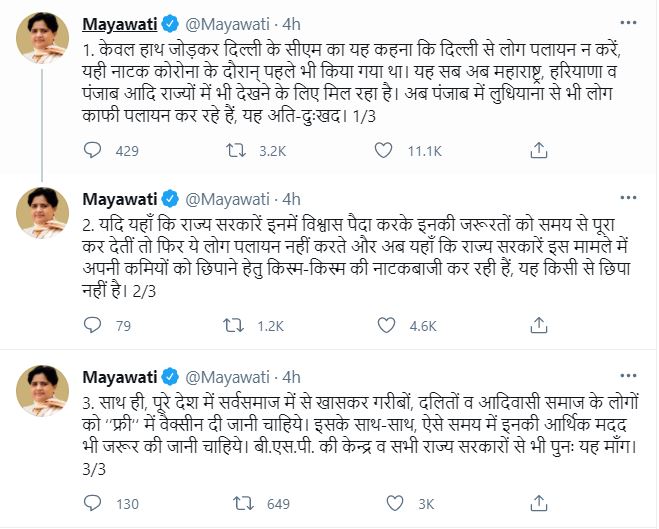 मायावती ने शनिवार को ट्वीट किया, "केवल हाथ जोड़कर दिल्ली के सीएम का यह कहना कि दिल्ली से लोग पलायन न करें, यही नाटक कोरोना के दौरान पहले भी किया गया था। यह सब अब महाराष्ट्र, हरियाणा व पंजाब आदि राज्यों में भी देखने के लिए मिल रहा है। अब पंजाब में लुधियाना से भी लोग काफी पलायन कर रहे हैं, यह अति-दुःखद।"